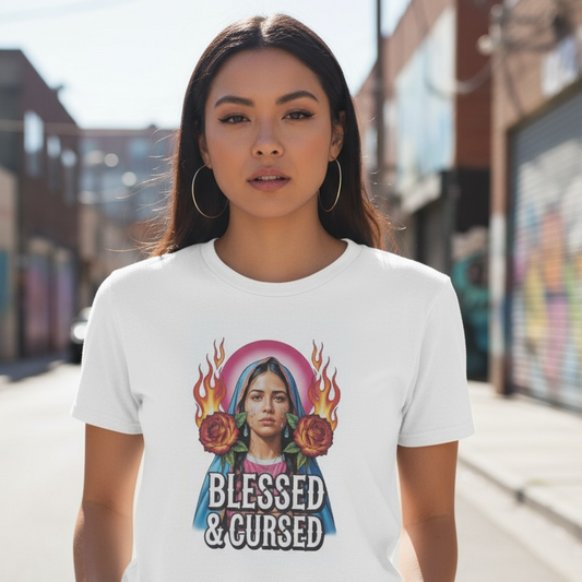 Camiseta Blessed & Cursed Unisex – Algodón Orgánico, Virgen con Rosas en Llamas